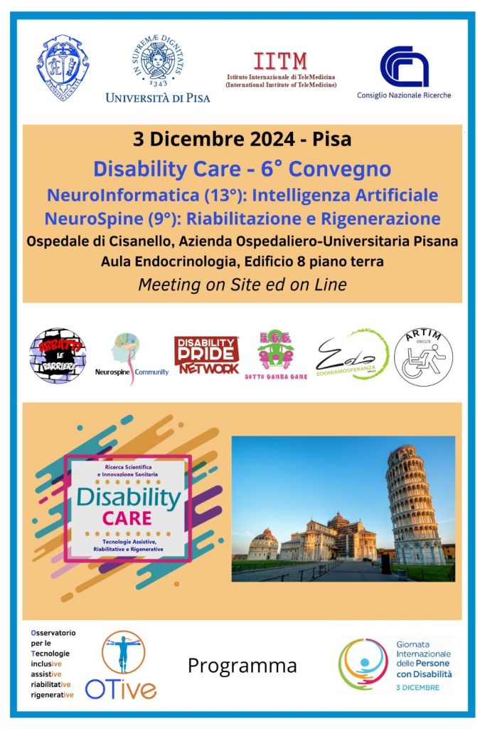Come ormai di consueto vi aspettiamo per l’evento scientifico Disability Care in occasione della giornata internazionale delle persone con disabilità 3 dicembre 2024, per l’edizione di quest’anno dalle 9 alle 18 presso l’ospedale Cisanello di Pisa.