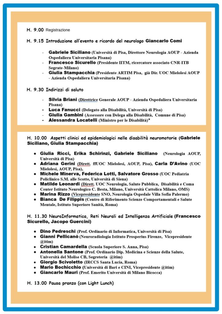 dalle interfacce cervello-computer (BCI) alla reti neurali artificiali, computazione neurale, con le reti neurali, machine learning ed altri algoritmi intelligenti , dalla realtà vituale a quella aumentata, dai sistemi (bio e neuro) robotici sensori, dispositivi meici e alla sensoristica digitale (IoT) importanti nel telemonitoraggio e nella riabilitazione anche a distanza, telemedicina e teleriabilitazione, dai Big Data all’analisi statistica e data mining necessari alla ricerca, agli studi osservazionali ed alle sperimentazioni e pratiche cliniche. Tecnologie sempre più innovative da mettere maggiormente a disposizione degli operatori sanitari nelle loro attività di diagnosi, terapie, controllo e riabilitazione.